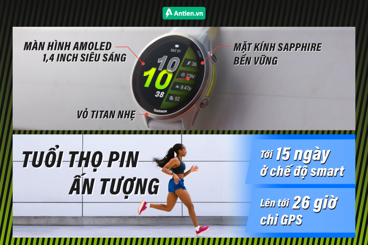 Bên cạnh đó, thiết bị còn bổ sung loạt tính năng hiệu suất, cực kỳ cần cho dân chạy pro như: Sức bền chạy bộ, Hiệu suất chạy bộ, Biến động giảm tốc (khi được kết hợp với dây đeo HRM 600), đi kèm là Kế hoạch luyện tập cá nhân hóa từ Garmin Triathlon Coach, Vòng chạy tự động theo cổng tính giờ (Auto Lap), Đề xuất vạch đích, Dự đoán thời gian đua.