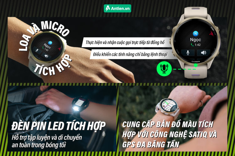 Garmin Forerunner 970 còn tích hợp loa/micro hỗ trợ nghe và thực hiện cuộc gọi, ra lệnh giọng nói cùng các tính năng sức khoẻ mới như Báo cáo tối, Theo dõi nhiệt độ da qua đêm, Biến thể hơi thở.