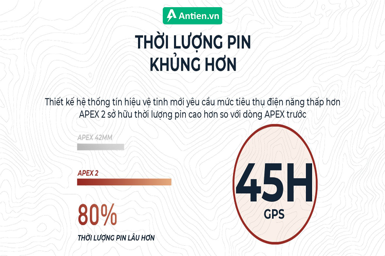 Với Apex 2, nhờ việc thiết kế lại tín hiệu vệ tinh mới, mức tiêu thụ điện năng thấp hơn giúp cho Apex 2 sở hữu thời lượng pin GPS cao hơn so với phiên bản Apex trước. Cụ thể Apex 2 cung cấp 45 giờ sử dụng GPS liên tục, cao hơn 80% so với Coros Apex 42mm. Hơn nữa, chỉ với 2 giờ sạc pin thì Apex 2 đã sẵn sàng sử dụng với đầy 100% pin. Kết hơp với anten hiệu suất cao hơn 50% và chipset All-Stateline GNSS tương tự như dòng đồng hồ Coros mạnh mẽ nhất Vertix 2, Apex 2 nhận tín hiệu từ cả 5 hệ thống vệ tinh chính, cho dữ liệu chính xác nhất có thể.