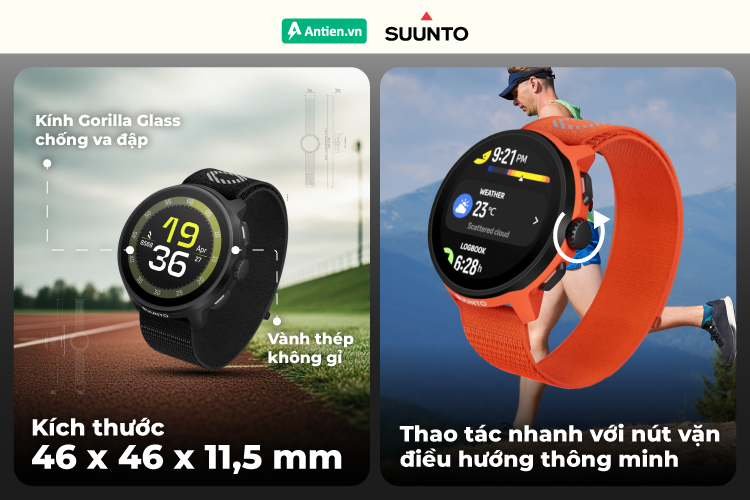 Với kích thước 46 x 46 x 11,5 mm và trọng lượng chỉ 36 gram, đây chính là chiếc đồng hồ nhẹ nhất Suunto từng tạo ra - một lợi thế lớn cho những runner muốn bay bổng trong từng sải chân.