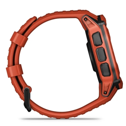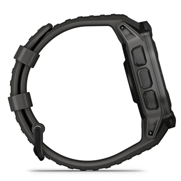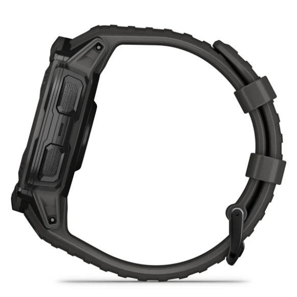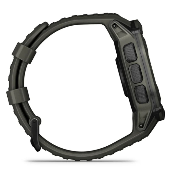 Hoàn toàn không sử dụng màn hình cảm ứng, bạn có thể điều hướng các tính năng trên thiết bị đeo Instinct 2X Solar thông qua ba nút bấm vật lý ở bên trái và hai nút ở bên phải.
