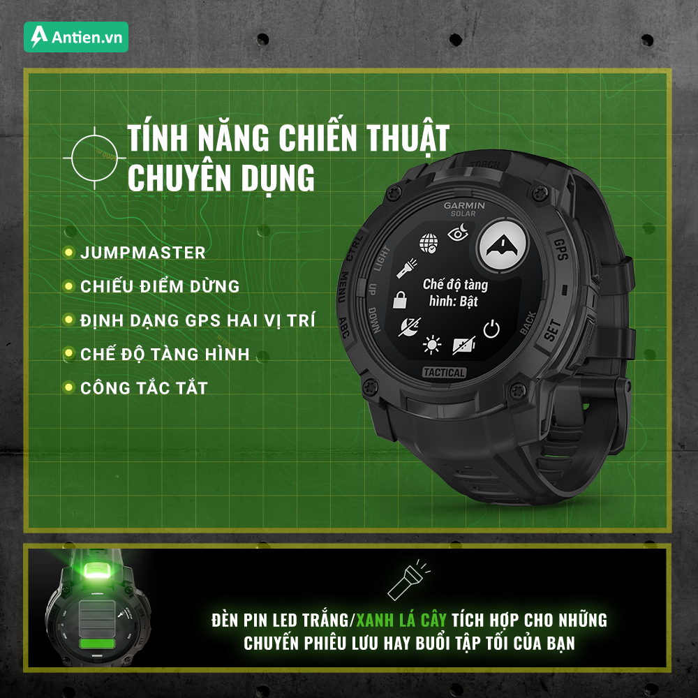 - Hoạt động chiến thuật: Xem thời gian, tốc độ, thời gian trong ngày, độ cao và vị trí của bạn theo cả hai loại tọa độ.