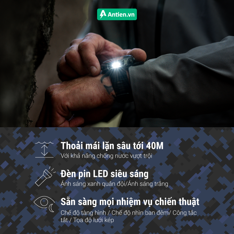 - Chế độ tàng hình (Stealth Mode): Khi kích hoạt, đồng hồ sẽ ngăn chặn rò rỉ thông tin vị trí và bảo vệ dữ liệu nhạy cảm, giúp người dùng ẩn mình hoàn toàn trong môi trường tác chiến.