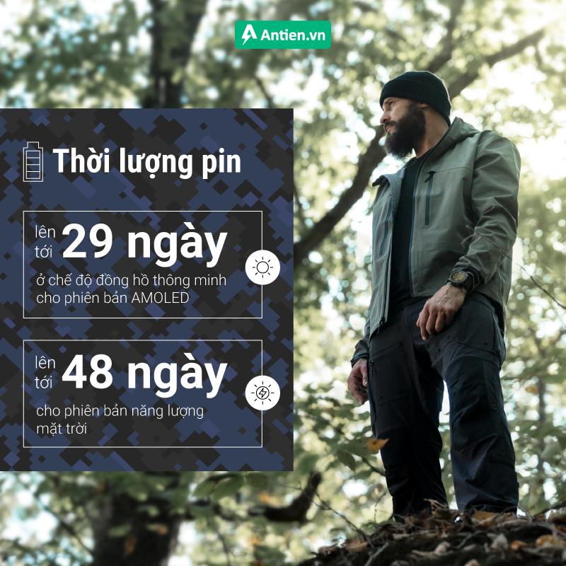 - Chế độ đồng hồ thông minh: Lên đến 30 ngày/48 ngày với năng lượng mặt trời