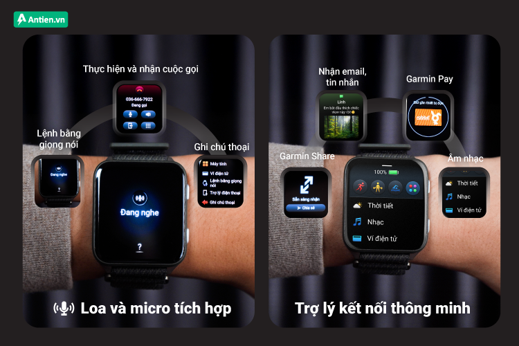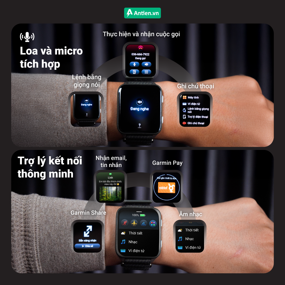 Khi được ghép nối với smartphone, đồng hồ thông minh Venu X1 cho phép bạn nhận thông báo email, tin nhắn và cảnh báo ngay trên cổ tay mà không cần rút điện thoại, không bỏ lỡ điều gì quan trọng. Nhờ tích hợp micro và loa, bạn có thể thực hiện và nhận cuộc gọi từ cổ tay, trả lời tin nhắn bằng giọng nói, hay ra lệnh nhanh qua trợ lý ảo - tất cả chỉ bằng một thao tác đơn giản.