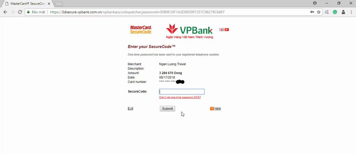 B9: Nhập chính xác dãy số bảo mật được gửi về điện thoại hoặc email. Nhấn "Submit" để tiến hành bước tiếp theo.