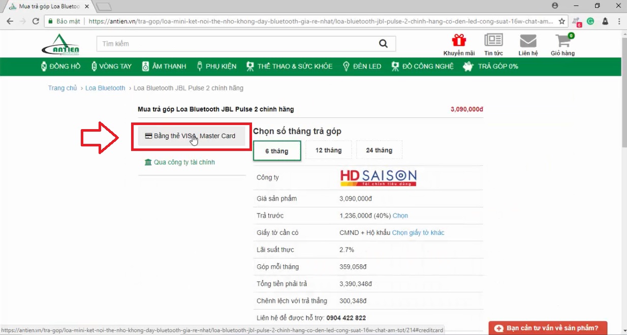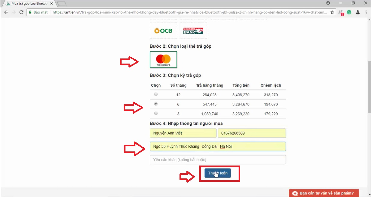 Để thực hiện mua hàng trả góp qua thẻ tín dụng các bạn làm theo những bước sau đây: