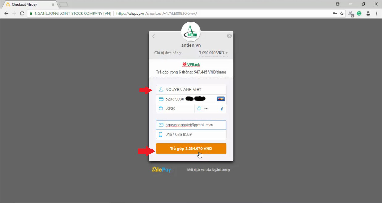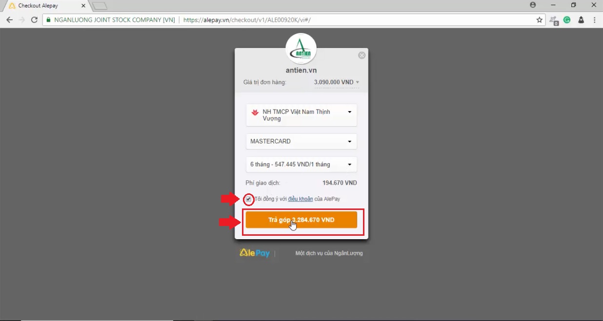 Chú ý: Sau khi hoàn tất các bước đặt mua trả góp trên website thì nhân viên của AlePay sẽ chủ động liên lạc cho bạn qua điện thoại để xác minh giao dịch. Nếu không có gì sai sót, nhân viên của AlePay sẽ thông báo tới ngân hàng phát hành thẻ tín dụng của bạn để thực hiện giao dịch trả góp đồng thời thông báo giao dịch thành công tới An Tiến. Nhân viên An Tiến chúng tôi sẽ ngay lập tức gọi điện cho bạn để xác nhận đơn hàng và tiến hành chuyển hàng cho bạn.