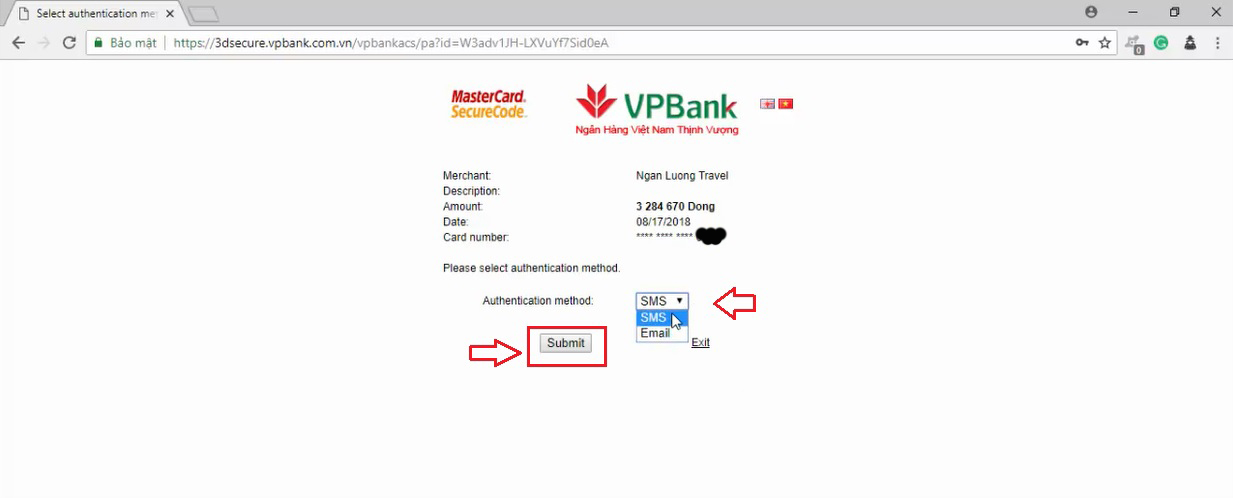 B8: Chọn phương thức để nhận dãy số bảo mật xác nhận giao dịch rồi ấn "Submit".