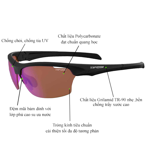 Chưa hết với lớp phủ chống chói đặc biệt của Tifosi được trang bị lên mặt kính làm giảm thiểu tối đa độ mạnh của các nguồn sáng, giúp đôi mắt giảm mệt mỏi và chống lóa khi sử dụng. Ngoài ra mắt kính được trang bị khả năng chống tia cực tím 100% với độ bảo vệ mắt chuẩn UV400 giúp bảo vệ mắt tuyệt đối trước các tác hại của ánh nắng mặt trời khi người đeo hoạt động thể thao ngoài trời trong thời gian dài.