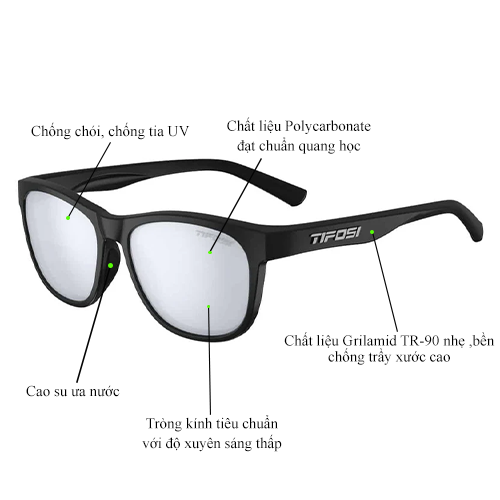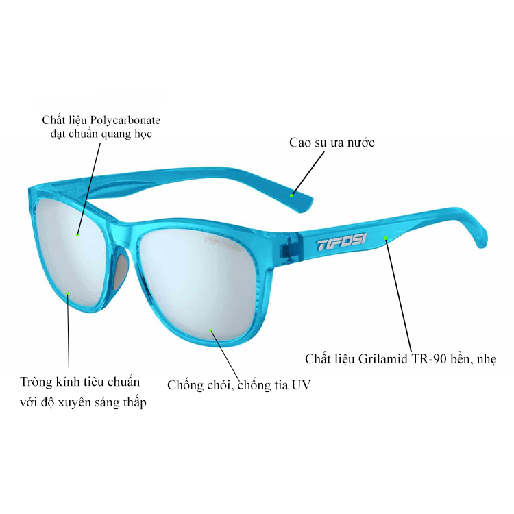 Kính mắt thể thao Tifosi Swank có phần tròng kính được làm từ chất liệu Polycarbonate có độ bền cao, khả năng chống trầy xước tốt và chịu được tác động của thời tiết khi sử dụng lâu dài. Tròng kính được trang bị tròng kính tiêu chuẩn Smoke Bright Blue với độ xuyên sáng là 15% phù hợp với các hoạt động ngoài trời trong điều kiện ánh sáng mạnh, giúp tầm nhìn người dùng rõ hơn. Ngoài ra, tròng kính Smoke Bright Blue được phủ 1 lớp màng chống chói đặc biệt của Tifosi giúp mắt người dùng chống lóa, cùng với độ bảo vệ mắt lên đến UV400 và khả năng chống tia UV 100% bảo vệ mắt khỏi các tác hại đến từ tia cực tím khi hoạt động thể thao ngoài trời trong khoảng thời gian dài.