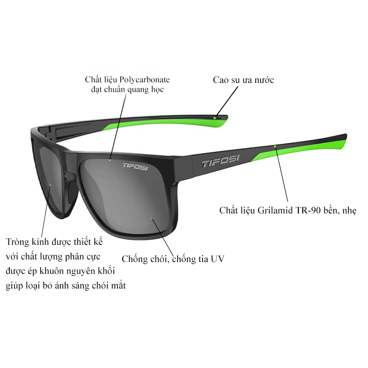 Tròng kính của mắt kính thể thao Tifosi Swick Satin Black/Neon được làm bằng chất liệu Polycarbonate có độ bền và khả năng chống trầy xước cao khi va đập cùng với khả năng chịu tác động của thời tiết tốt. Với tròng kính được thiết kế hoàn toàn nguyên khối từ chất liệu phân cực thay vì chỉ phủ lớp phân cực bên ngoài như các sản phẩm kính khác giúp tránh bị bào mòn hoặc phai màu theo thời gian. Với công nghệ Polarized, tròng kính có độ xuyên sáng là 13% cùng màu sắc của tròng kính được thiết kế để loại bỏ ánh sáng gây chói mắt, tăng cường độ tương phản màu sắc giúp phân biệt các chi tiết tốt hơn, đặc biệt là trong điều kiện ánh sáng mạnh. Cùng với đó sản phẩm cung cấp khả năng chống tia cực tím 100% giúp bảo vệ mắt người sử dụng tuyệt đối. Điều này cực kỳ phù hợp khi khách hàng sử dụng sản phẩm cho các môn thể thao nước hay các môn thể thao tuyết vì với tròng kính phân cực Polarized sẽ giúp loại bỏ ánh sáng chói phản chiếu từ mặt nước, mặt tuyết, giúp người dùng có thể nhìn rõ hơn và tránh hiện tượng mỏi mắt.