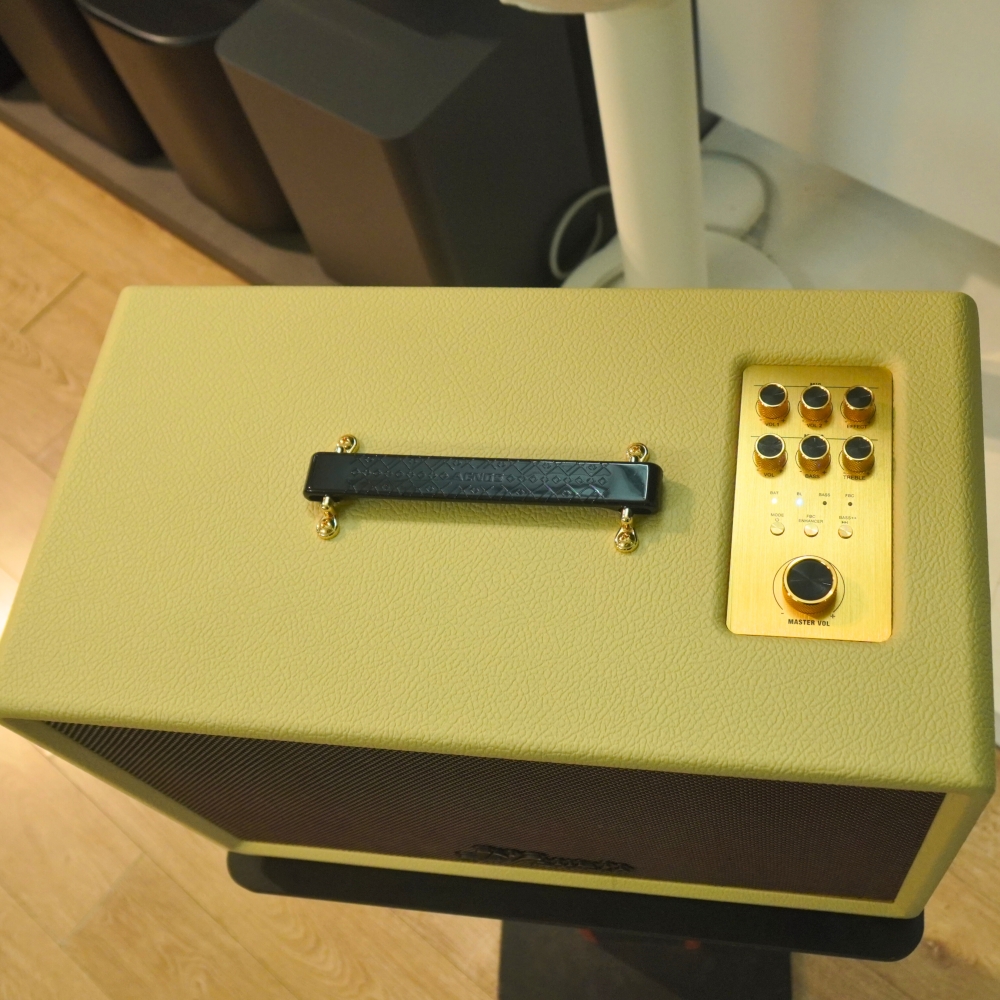 Mặt trước của loa nổi bật với logo KBEATBOX tinh tế kết hợp cùng lớp lưới dọc màu nâu không chỉ tạo điểm nhấn thị giác mà còn bảo vệ hiệu quả hệ thống củ loa bên trong khỏi tác động từ môi trường bên ngoài. Với kích thước cân đối 340 x 485 x 260 mm cùng trọng lượng khoảng 19kg, Acnos D Auris 300 mang đến cảm giác đầm chắc, cao cấp và phù hợp đặt trong phòng khách, phòng giải trí hay mang theo cho các buổi tiệc ngoài trời.