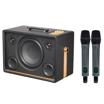 Sản phẩm được trang bị sẵn hai micro không dây UHF với vỏ nhôm cao cấp, mang lại cảm giác cầm chắc tay, nhẹ hơi và dễ kiểm soát khi hát karaoke. Micro có độ nhạy cao, bắt giọng tốt và kết hợp hoàn hảo với các công nghệ xử lý âm thanh của loa, giúp người dùng tự tin thể hiện giọng hát mà không cần đầu tư thêm thiết bị bên ngoài.
