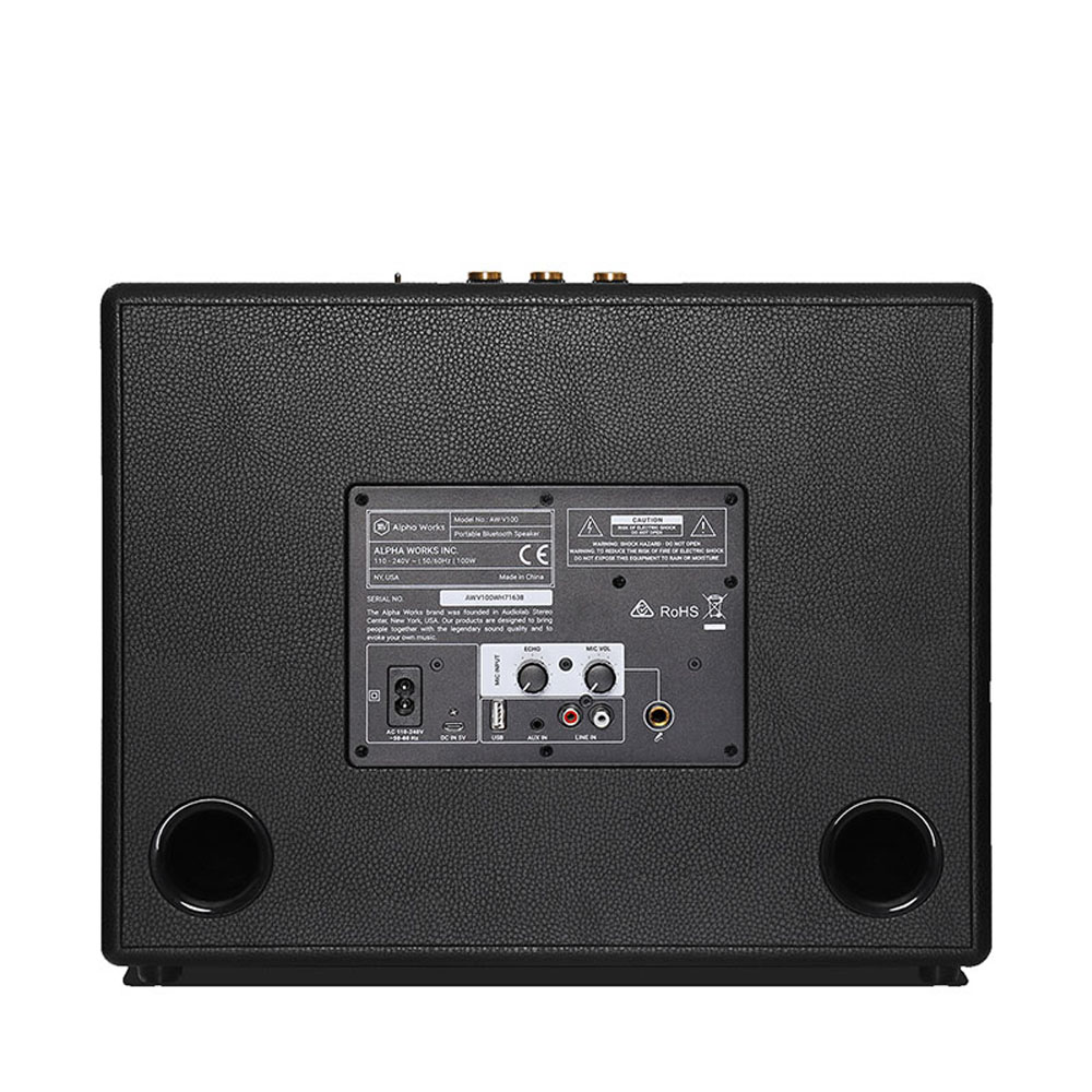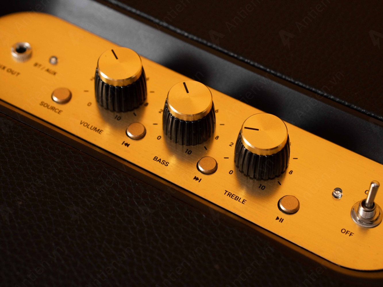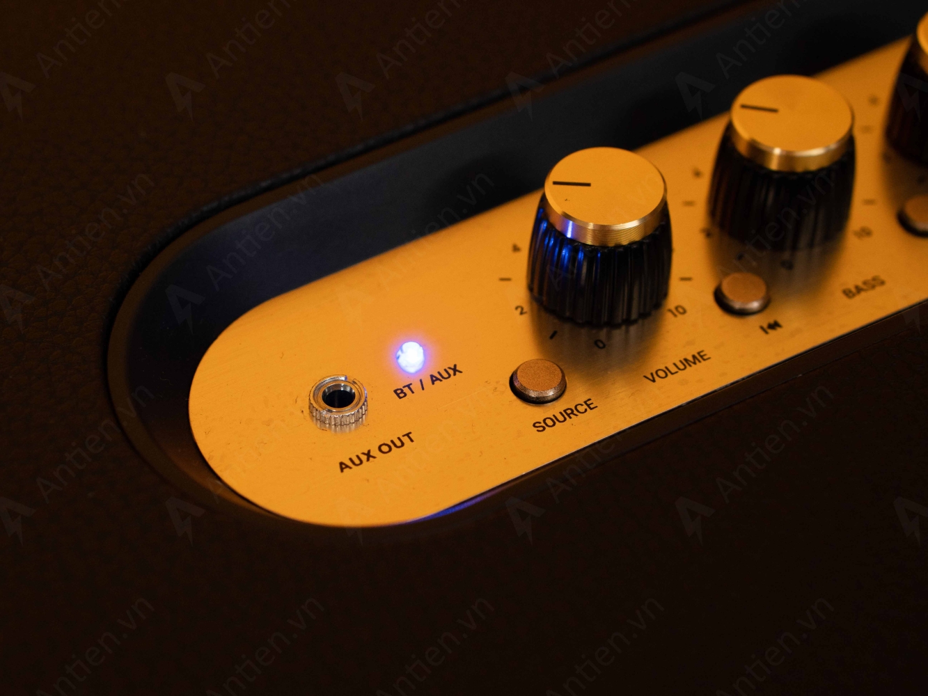 Phía trên loa Alpha Works Classic V100 vẫn là phần panel bố trí đèn báo trạng thái Bluetooth/ AUX, cổng AUX OUT, phím chức năng như: chọn Source, Play/ Pause, Previous/ Next. Cụm nút điều chỉnh âm lượng, bass, treble với thiết kế núm xoay truyền thống giúp các giai điệu từ các bản nhạc được tùy chỉnh dễ dàng theo ý muốn người sử dụng. Ngoài ra, nút On/ Off được làm dạng công tác gạt đem tới sự tiện lợi hơn so với công tắc thông thường.