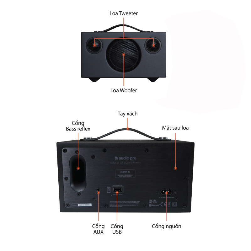 Loa Bluetooth Audio Pro Addon T3+ sở hữu hai loa tweeter có đường kính 19 mm kết hợp với một loa trung / trầm 89 mm được trang bị phản xạ âm trầm. Sự hiện diện của lỗ thông hơi giúp bạn có thể có được độ mở rộng tuyệt vời trong âm trầm và hai loa tweeter đảm bảo tái tạo âm bổng rõ ràng và chi tiết. Mỗi loa đều có mô-đun khuếch đại kỹ thuật số riêng, đảm bảo tái tạo được kiểm soát hoàn hảo. Trong đó, có hai mô-đun 5 watt cho loa tweeter và một mô-đun 15 watt cho loa midrange / bass. Do vậy, loa Audio Pro Addon T3 + được hưởng lợi từ tổng công suất 25 watt và hiển thị tần số đáp ứng từ 60 Hz đến 20 kH.