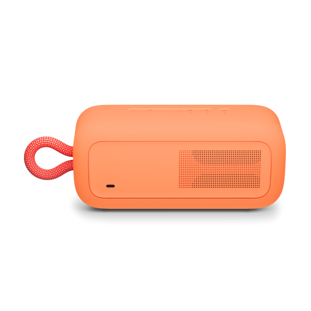 Mặt trên của loa tích hợp các nút điều khiển trực quan, bên hông có dây đeo tiện lợi và phía sau là cổng USB-C đa năng.