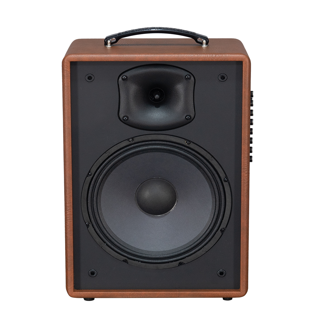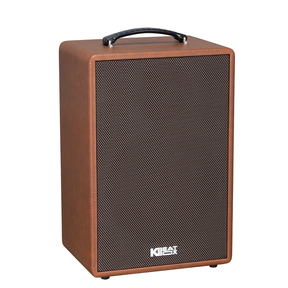 • Thiết kế nhỏ gọn, sang trọng: Thùng gỗ bọc da, có quai xách chắc chắn, chân đế loa, mặt lưới vải xám.