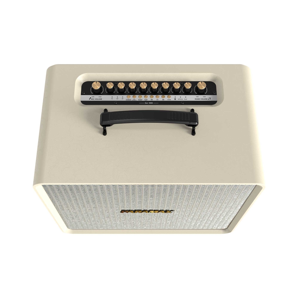 Với công suất 200W cùng áp suất âm thanh đạt tới 105dB, loa có khả năng phủ âm tốt trong nhiều không gian khác nhau từ phòng khách gia đình đến các buổi tiệc nhỏ ngoài trời. Ngoài ra, thiết bị còn được trang bị pin Lithium-iron dung lượng cao 12.8V – 6Ah tương đương 76.8Wh, mang lại thời gian sử dụng ổn định cho các buổi giải trí kéo dài.
