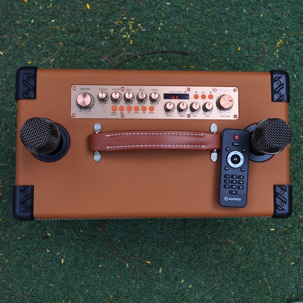 Mặt trên của loa Sumico BT-S52 cũng là nơi đặt các núm xoay và phím chức năng, cho phép người dùng tùy chỉnh âm lượng tổng, chỉnh bass, treble, tinh chỉnh chi tiết cho tiếng micro cũng như điều chỉnh các hiệu ứng vang như echo và reverb khi hát karaoke, đi kèm đó là một chiếc remote điều khiển từ xa giúp bạn có thể ngồi một chỗ vẫn thoải mái chuyển nguồn vào, tăng giảm âm lượng hoặc chuyển chế độ mà không cần lại gần loa.