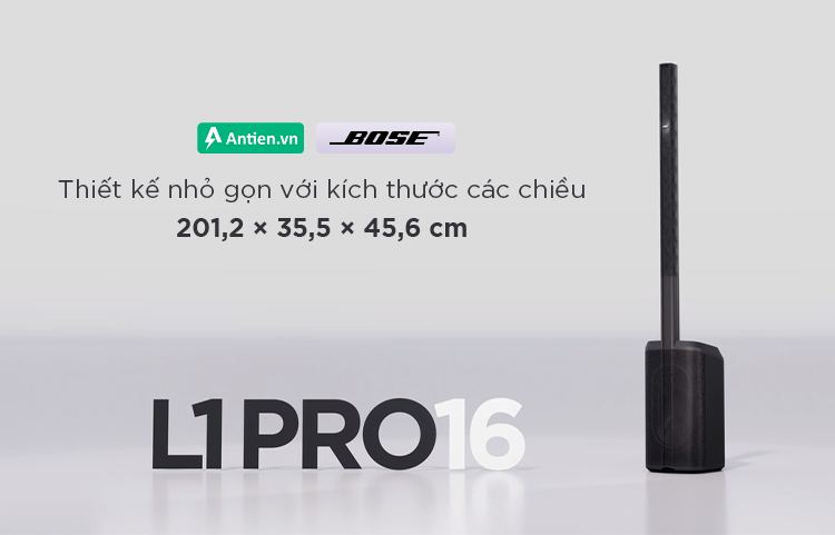 Loa Bose L1 Pro16 sở hữu thiết kế nhỏ gọn với kích thước các chiều lần lượt là 201,2 × 35,5 × 45,6 cm và trọng lượng chỉ 24,8kg nên vô cùng thuận tiện trong việc di chuyển đến khắp nơi mà bạn mong muốn.