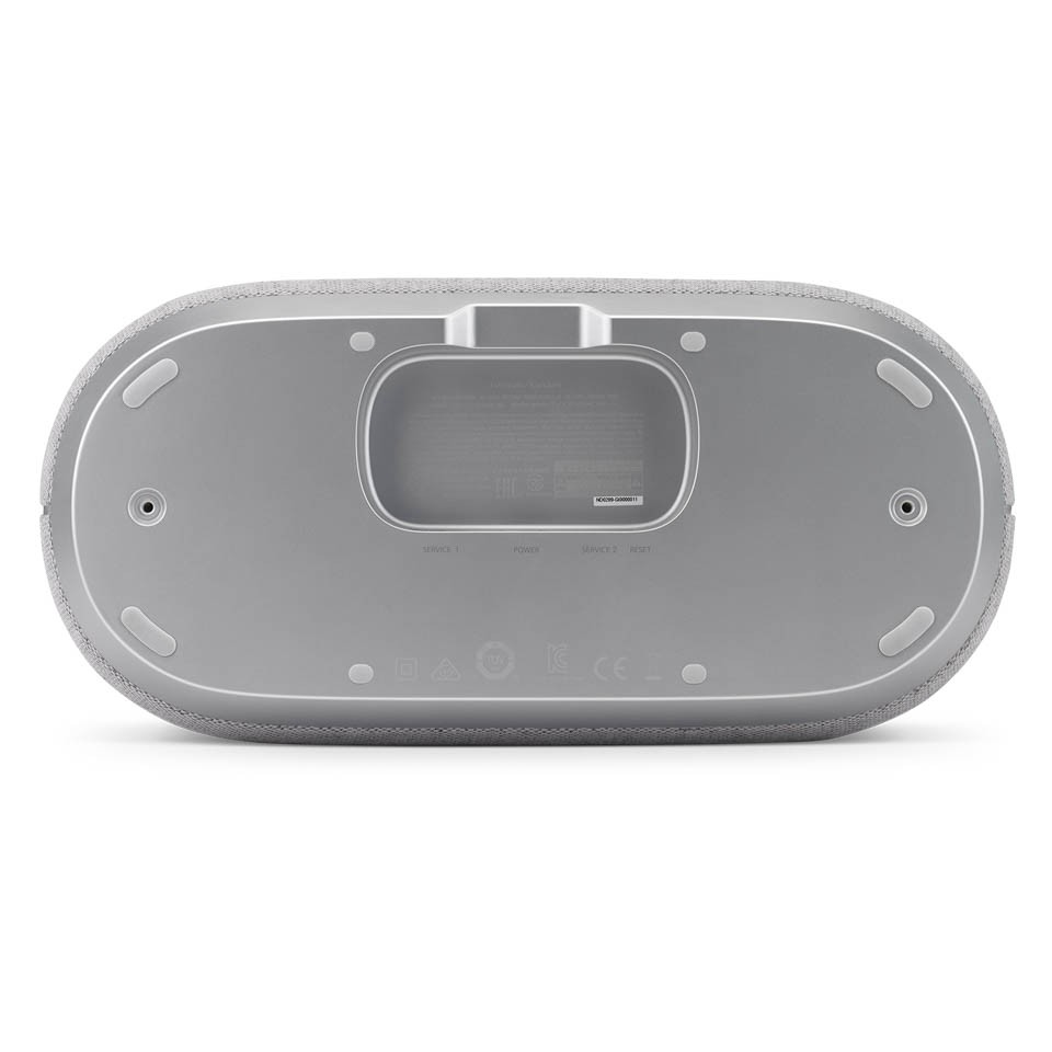 Mặt đáy loa là cổng sạc nguồn và các cổng reset, service 1, service 2. Mặt trên này là 1 miếng kim loại với 1 màn hình cảm ứng cho bạn thao tác Play, Pause, Chuyển bài, Back bài và chỉnh setting. Xung quanh màn hình cảm ứng là 2 nút tăng giảm âm lượng cùng với 2 micro để hỗ trợ cho việc nhận lênh từ giọng nói của người dùng.