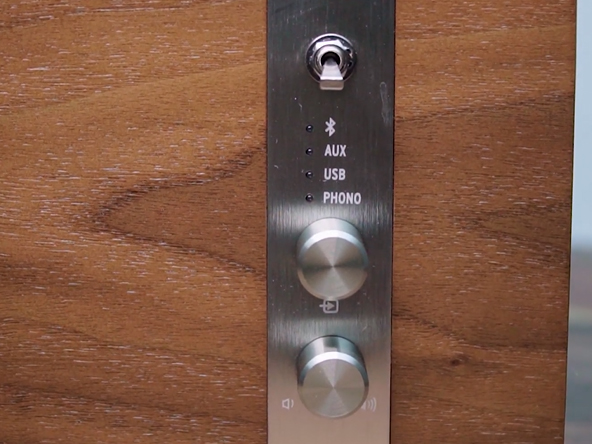 Trên đỉnh Klipsch The Three II là cụm điều khiển với công tắc gạt On/Off điện nguồn, núm xoay chỉnh volume, núm xoay chọn kết nối tín hiệu đầu vào bằng đồng trắng cao cấp ánh kim bắt mắt, cho cảm giác điều khiển dễ dàng và mát tay thích thú mỗi khi sử dụng. Ở giữa công tắc và hai núm xoay là dãy đèn LED thông báo mức âm lượng và kết nối đang được sử dụng.