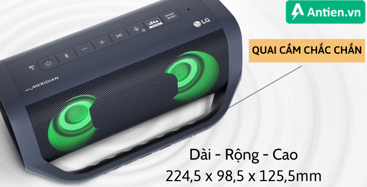 LG XBoom Go PN5 có kích cỡ 224.5 x 98.5 x 125.5 mm với trọng lượng chỉ 1,1kg. Thiết kế hình hộp chữ nhật cùng quai cầm tay tạo cảm giác nam tính, mạnh mẽ và cũng dễ dàng di chuyển.