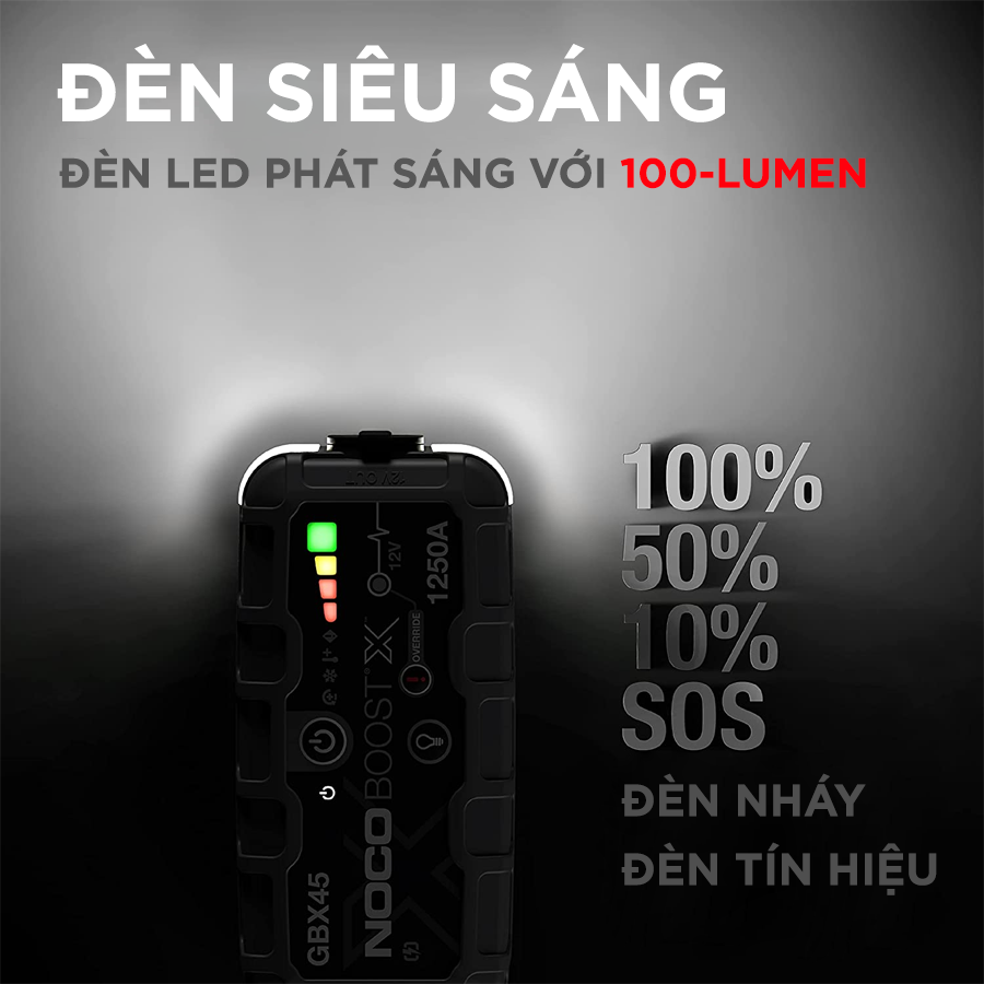 Bộ khởi động ô tô NOCO GBX45 được tích hợp đèn pin siêu sáng với cường độ cao 100 lumen giúp bạn chiếu sáng khi tối. Nó có 7 chế độ ánh sáng bao gồm cả SOS để sử dụng trong nhiều trường hợp khác nhau. Đèn làm việc cường độ cao này cung cấp nhiều giờ hoạt động cho bạn giúp bạn dễ dàng hoạt động khi trời tối hoặc thậm chí cảnh báo cho các phương tiện khác khi bạn cần hỗ trợ bên đường.