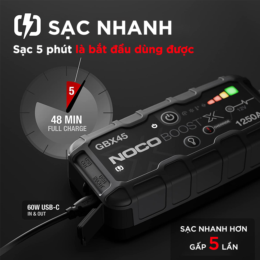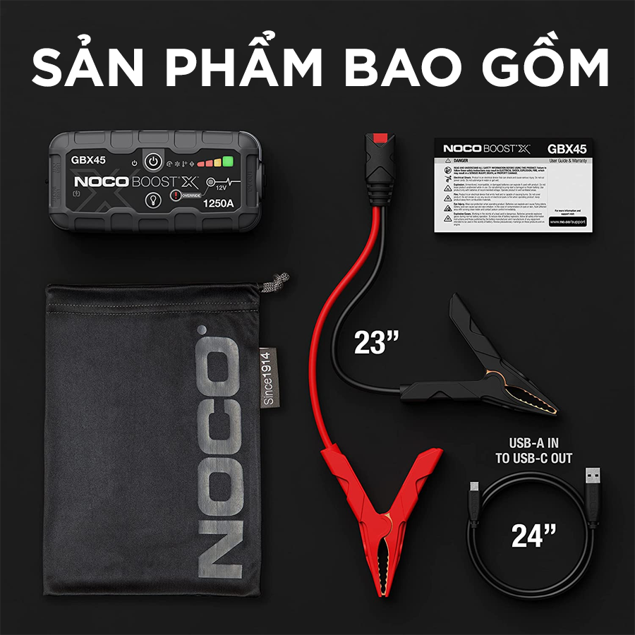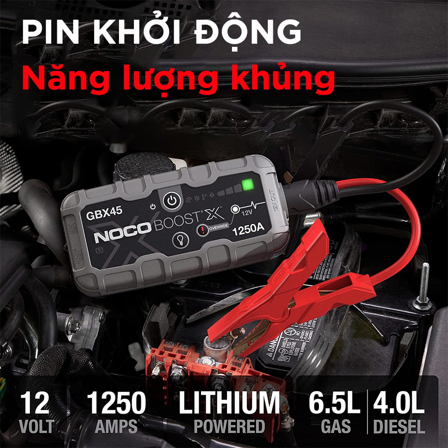 NOCO Boost X GBX45 là thiết bị khởi động pin lithium di động (12 volt) cho các loại xe có động cơ lên đến: động cơ xăng 6,5 lít và động cơ diesel 4,0 lít, bao gồm ô tô, xe máy, xe tải, ATV, tàu thuyền, RV, xe tải, SUV, máy kéo và hơn. Thiết kế hoàn toàn mới này cho công suất khởi động cực nhanh và giải phóng dòng điện tối đa lên đến 1.250 Ampe mỗi lần khởi động. Ngoài ra bộ kích nổ ô tô kiêm pin dự phòng này còn nhiều tính năng hữu ích khác hỗ trợ người dùng.