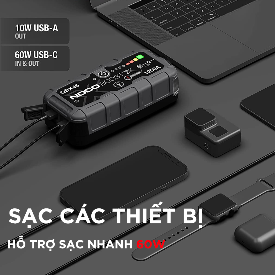 Không chỉ là 1 bộ kích nổ xe hơi, NOCO GBX45 còn là 1 cục sạc dự phòng thứ thiệt. Pin dự phòng kiêm bộ khởi động xe NOCO GBX45 được trang bị 2 cổng USB-A: 5VDC 2.1A Max / 10W và USB-C tối đa: 5V 3A / 9V 3A / 12V 3A / 15V 3A / 20V 3A cho phép bạn sạc lại các thiết bị di động của bạn như điện thoại, máy tính bảng,... nhiều lần.
