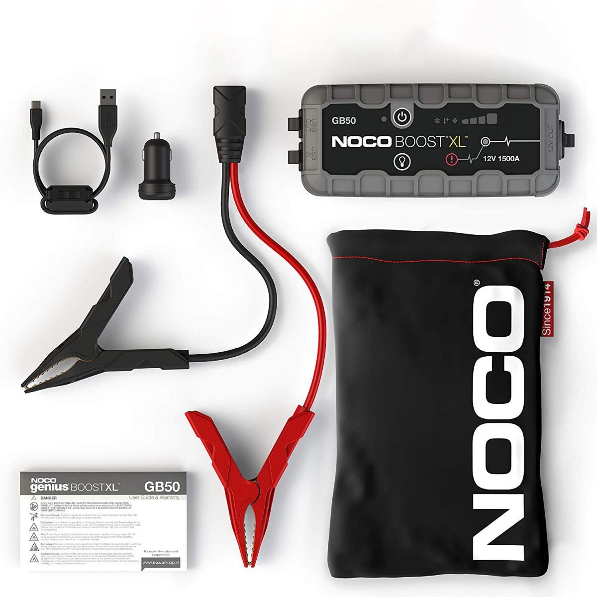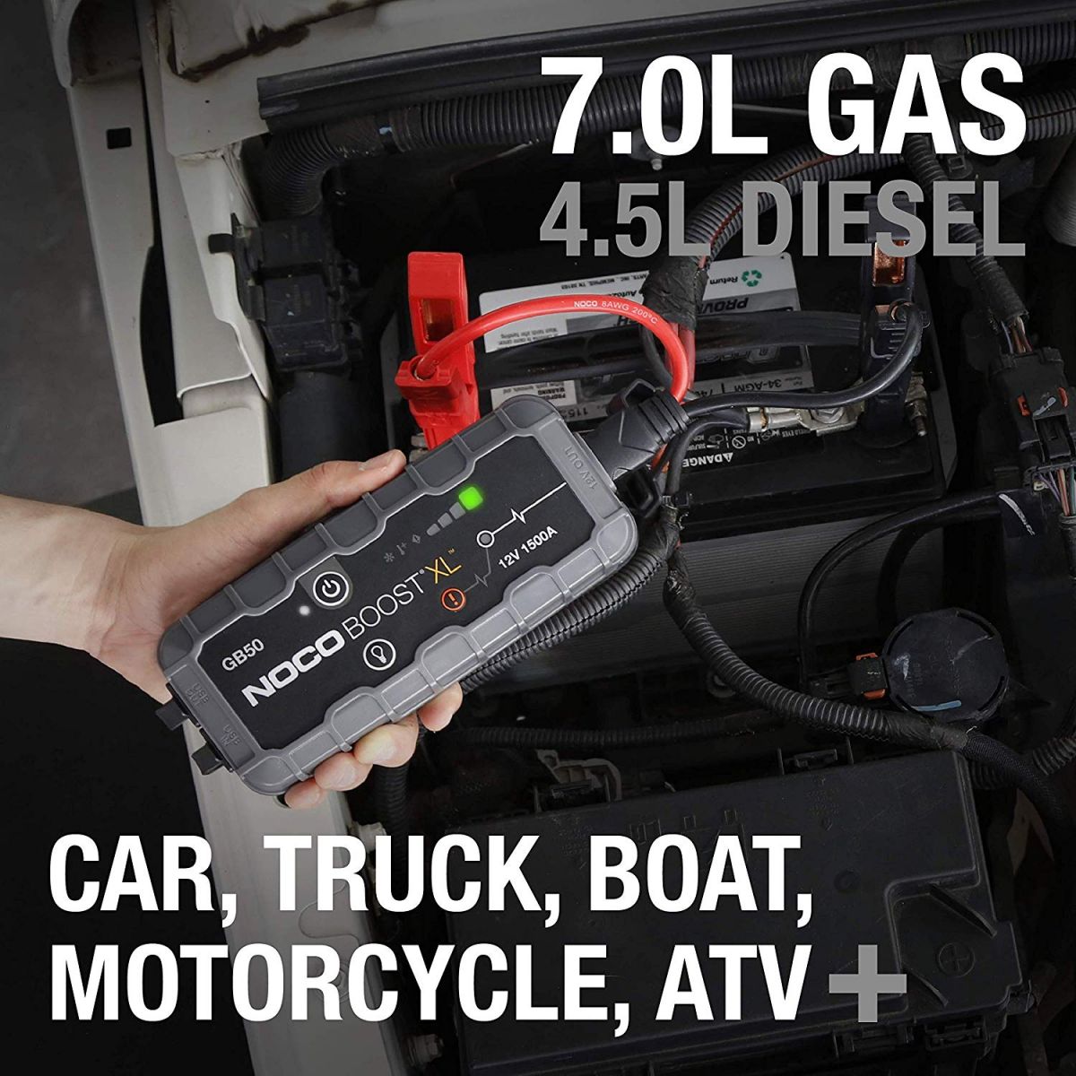 Pin dự phòng kiêm bộ khởi động xe NOCO GB50 là một bộ tăng áp ắc quy xe hơi dùng pin lithium-ion tiện dụng, cung cấp dòng điện cực đại lên đến 1500A để khởi động các xe của bạn. Trong vài giây, NOCO GB50 có thể tạo ra dòng điện lớn để khởi động nhiều loại xe khác nhau bao gồm ô tô, xe tải, thuyền, xe máy, xe tải, RV, v.v. Nó hỗ trợ tất cả các động cơ xăng lên đến 7 lít và động cơ diesel đến 4. 5 lít.