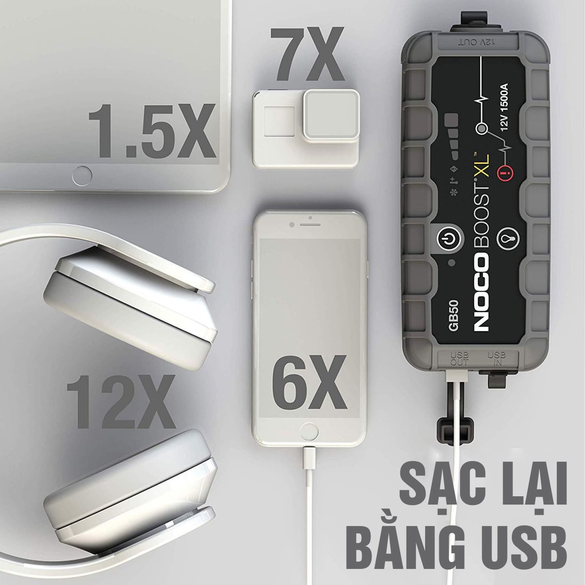 Không chỉ là 1 bộ kích nổ xe hơi, NOCO GB50 còn là 1 cục sạc dự phòng thứ thiệt. Pin dự phòng kiêm bộ khởi động xe NOCO GB50 được trang bị 1 cổng USB 2.1A cho phép bạn sạc lại các thiết bị di động của bạn như điện thoại, máy tính bảng,... nhiều lần.