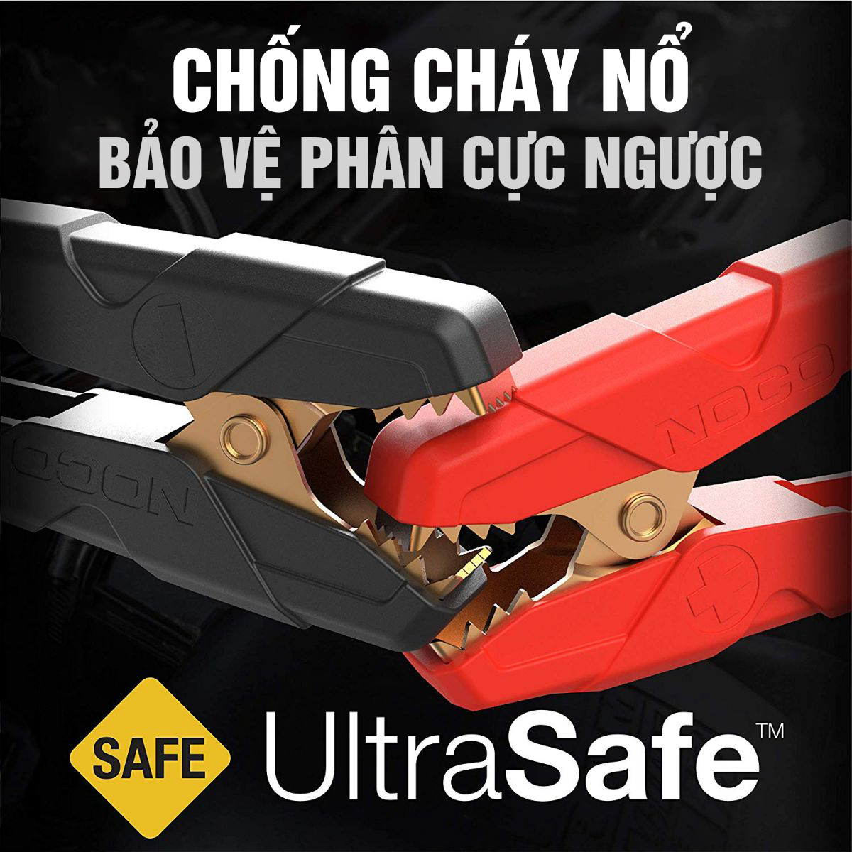 Bộ kích nổ ắc-quy ô tô NOCO GB70 sử dụng kẹp thông minh, an toàn với các tính năng chống cháy nổ và bảo vệ phân cực ngược, cắm lộn cực âm dương hay cho 2 cực chạm vào nhau không hề phát tia lửa điện, máy sẽ báo hiệu nếu cắm sai. Tất cả những điều này làm cho nó an toàn hơn để sử dụng cho người dùng.