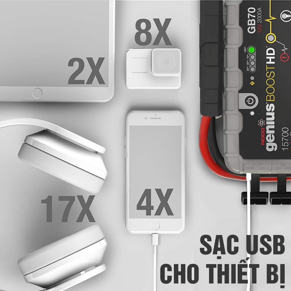Không chỉ là 1 bộ kích nổ xe hơi, NOCO GB70 còn là 1 cục sạc dự phòng thứ thiệt. Pin dự phòng kiêm bộ khởi động xe NOCO GB70 được trang bị 1 cổng USB 2.1A cho phép bạn sạc lại các thiết bị di động của bạn như điện thoại, máy tính bảng,... nhiều lần.