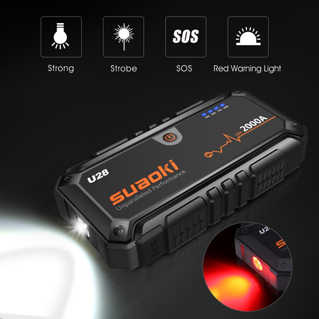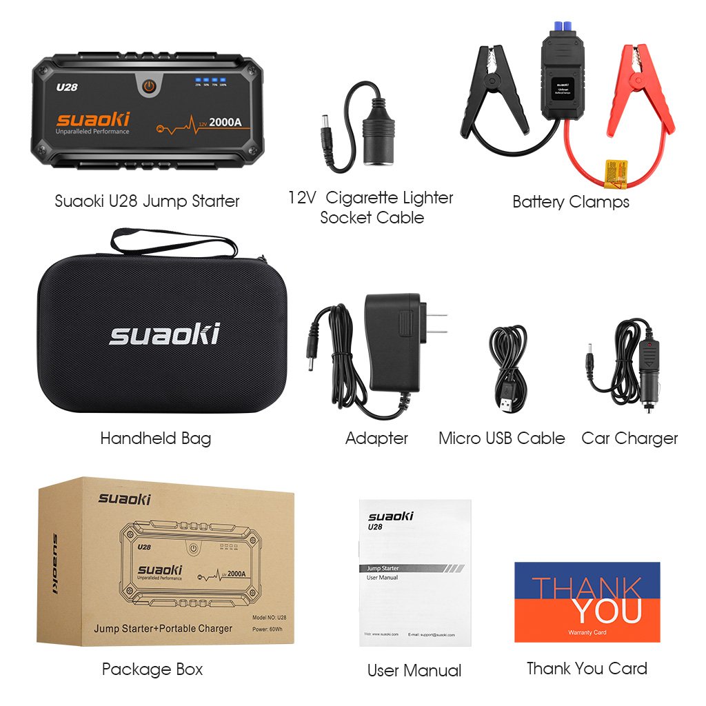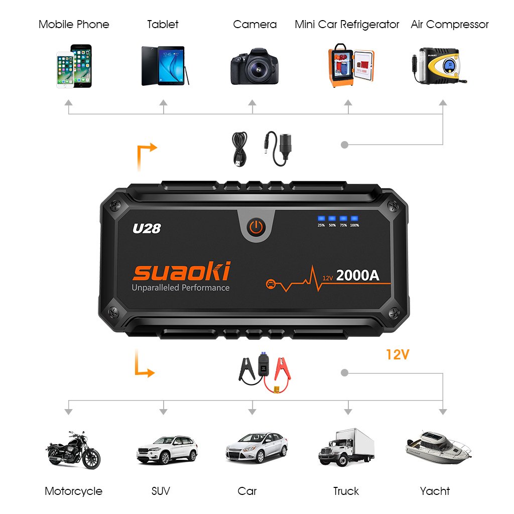 Pin dự phòng kiêm bộ kích nổ ô tô SUAOKI U28 là một bộ tăng áp ắc quy xe hơi dùng pin lithium-ion tiện dụng, cung cấp dòng điện cực đại lên đến 2000A để khởi động các xe của bạn. Trong vài giây, SUAOKI U28 có thể tạo ra dòng điện lớn để khởi động nhiều loại xe khác nhau bao gồm ô tô, xe tải, thuyền, xe máy, xe tải, RV, v.v. Nó hỗ trợ tất cả các động cơ xăng và động cơ diesel lên đến 8.0L.