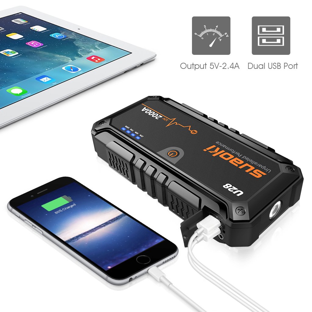 Ngoài ra, với hai cổng USB 5V/2.4A tích hợp, bạn có thể cấp nguồn cho nhiều thiết bị cùng một lúc, chẳng hạn như điện thoại thông minh, máy tính bảng, máy ảnh hành động, tai nghe không dây, thiết bị đeo và nhiều thiết bị khác. Bộ kích nổ ô tô Suaoki U28 có thể cung cấp nhiều giờ hoạt động cho các thiết bị di động của bạn nhiều lần trước khi cần sạc lại.