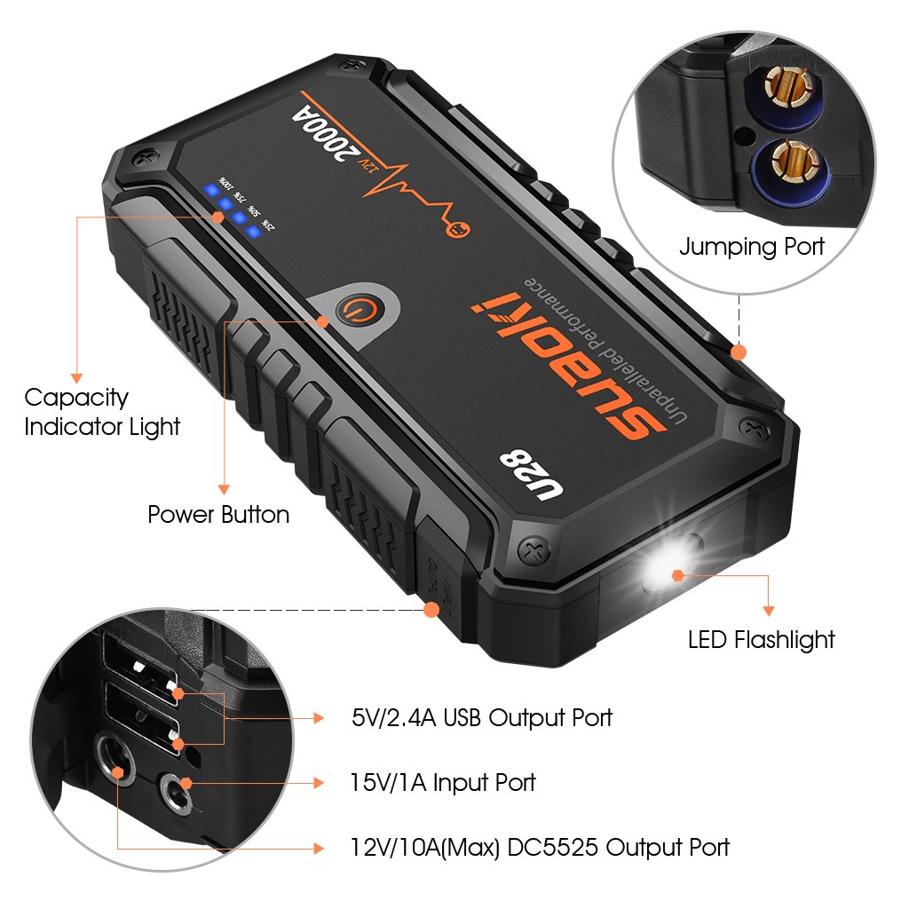 Được sản xuất từ những linh kiện chất lượng cao với quy trình kiểm soát nghiêm ngặt, Bộ kích nổ ô tô Suaoki U28 có khả năng cung cấp đầu ra mạnh mẽ (dòng điện cực đại 2000A) cho phép khởi động gần như tất cả các loại động cơ dầu và xăng, các dòng xe cá nhân và gia đình hiện nay có sử dụng bình ắc quy 12V (tất cả động cơ xăng hoặc động cơ diesel 8.0L).