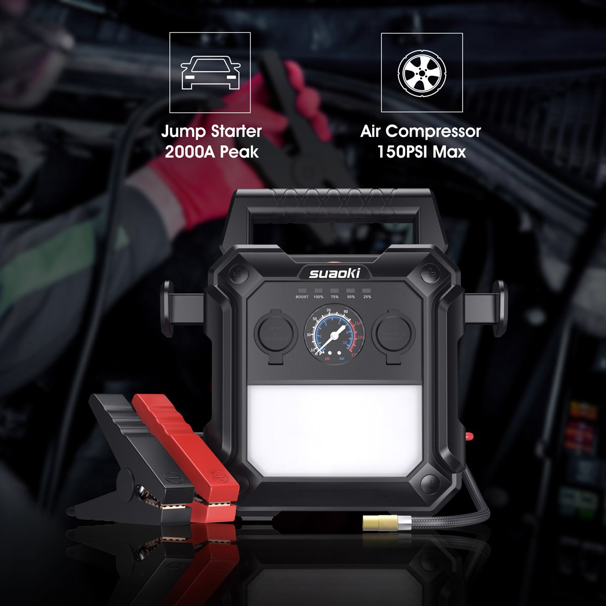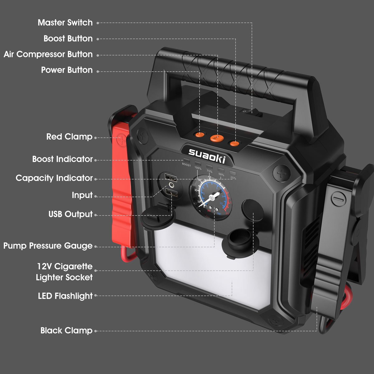 Một máy nén khí được tích hợp trong Bộ khởi động ô tô Suaoki U29, và nó được thiết kế để bơm lốp cho ô tô, xe đạp và xe máy, nhờ có 3 bộ điều hợp vòi phun đi kèm. Nó là một người bạn đồng hành tuyệt vời để cùng bạn đi trên đường, trong một chuyến đi hoặc kỳ nghỉ.