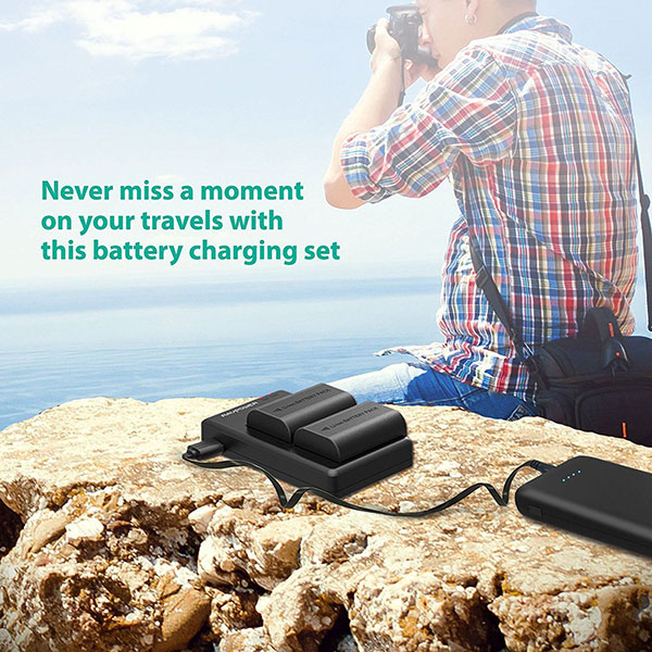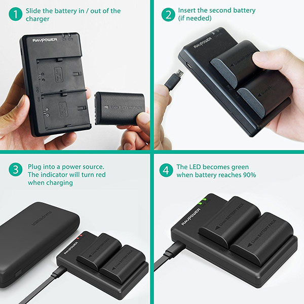 Bộ sạc và sạc pin máy ảnh RAVPower cung cấp cho bạn giải pháp backup hoàn chỉnh với hai pin thay thế phụ và bộ sạc kép để giữ pin cùng sạc.