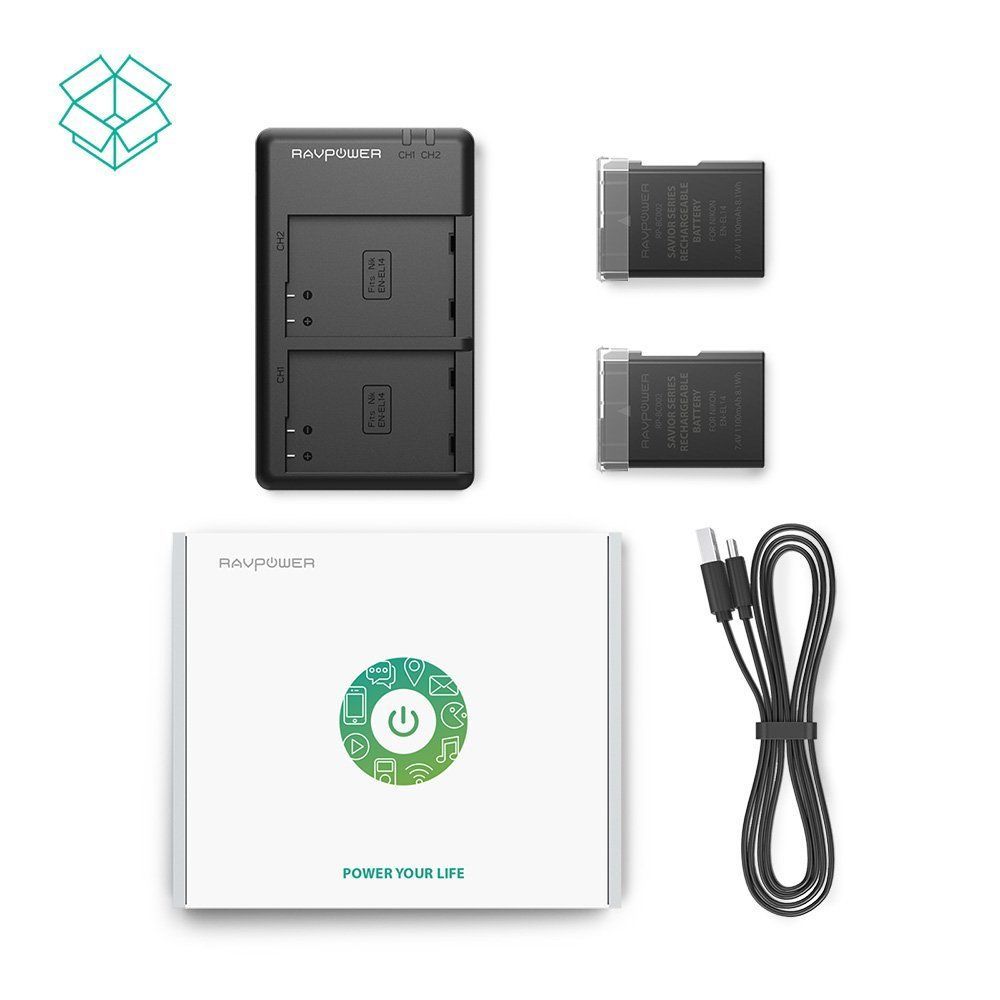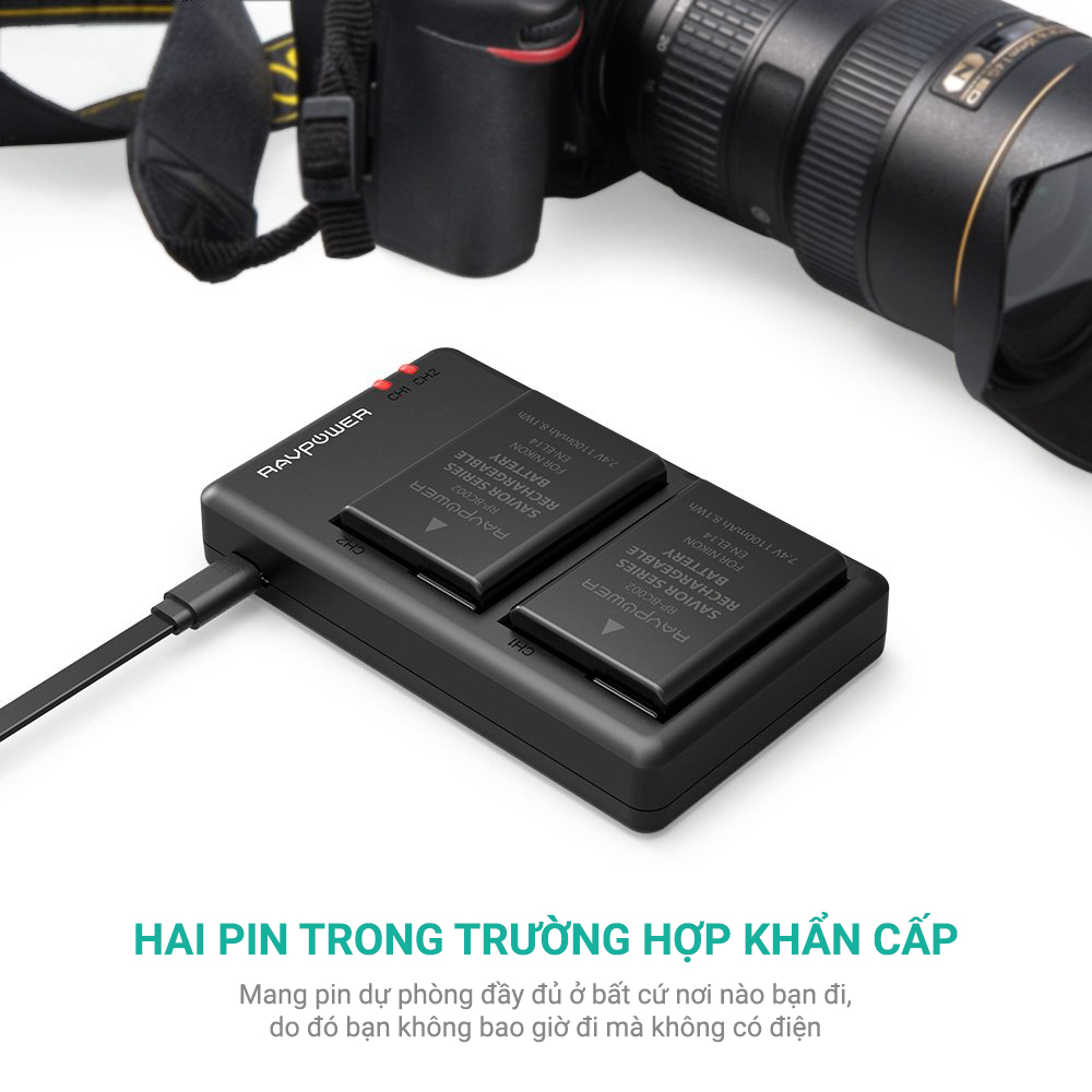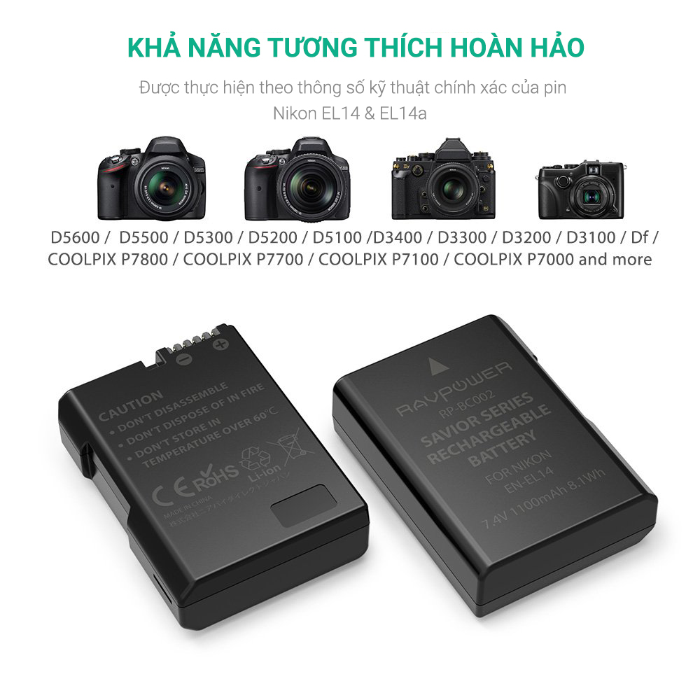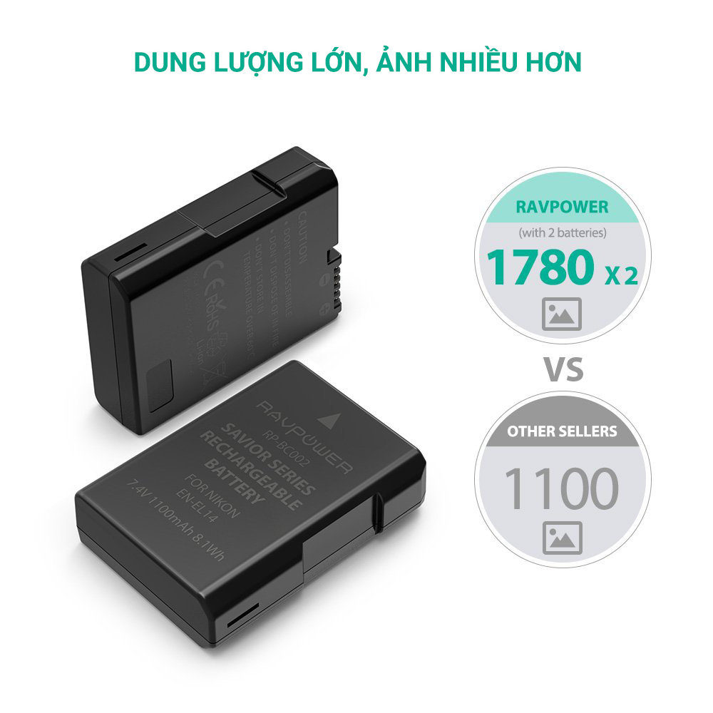 Pin máy ảnh cho Nikon EN-EL14 chính hãng RAVPower RP-BC002, bộ 2 pin 1100 mAh