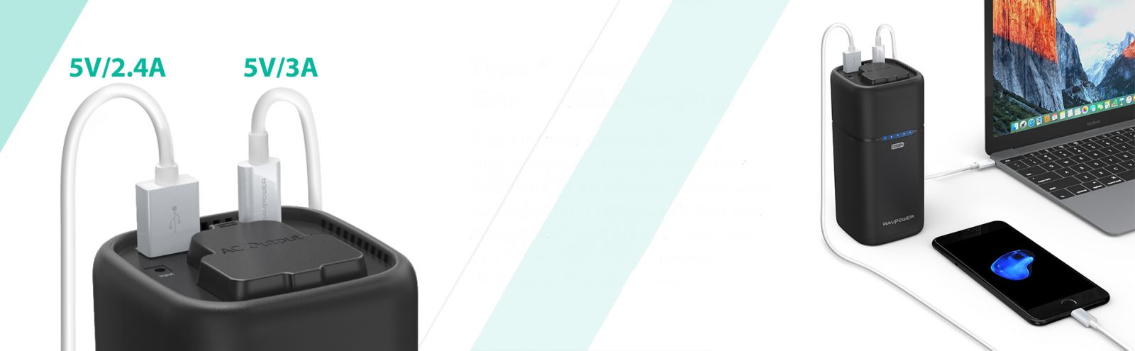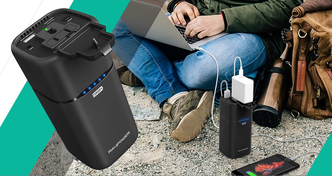 • Ổ cắm di động RAVPOWER 20100mAh tích hợp cổng sạc thế hệ mới Type-C (5V/3A) và Cổng USB 5V/2.4A công nghệ sạc nhanh và thông minh iSmart độc quyền cho phép sạc cho hai thiết bị cùng lúc.