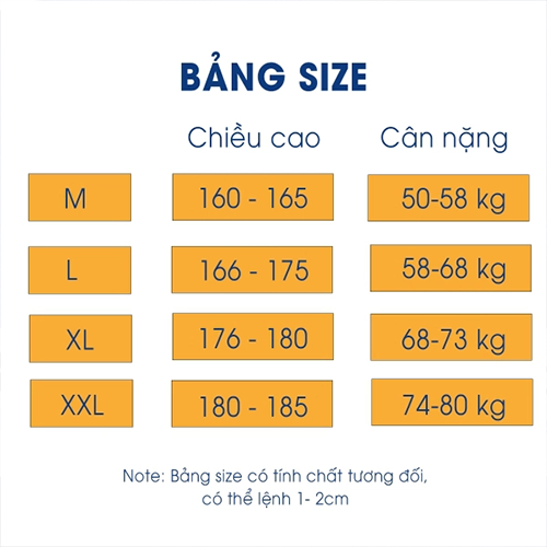 | Size | Chiều cao (cm) | Cân nặng (kg) |