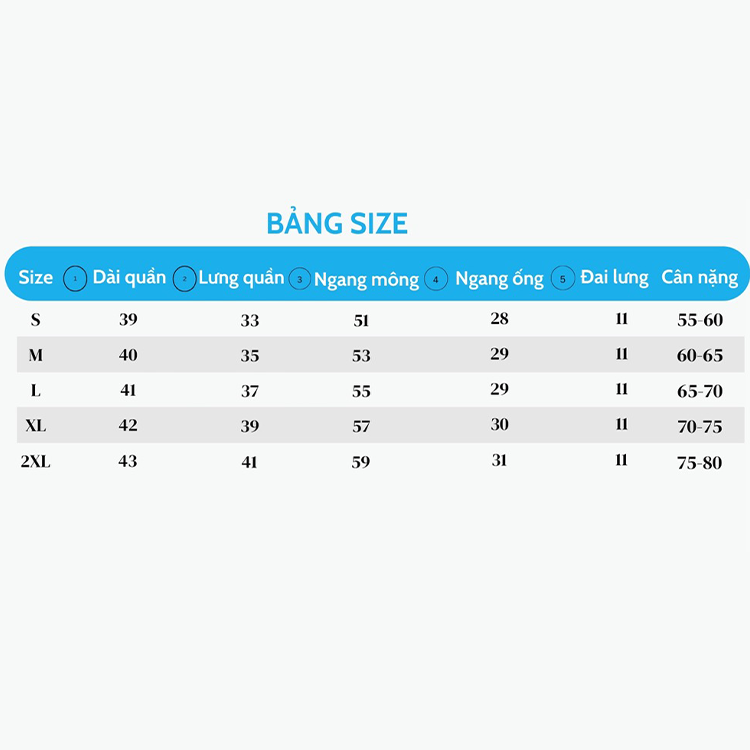 | Size | Dài quần (cm) | Lưng quần (cm) | Ngang mông (cm) | Ngang ống (cm) | Đai lưng (cm) | Cân nặng (kg) |