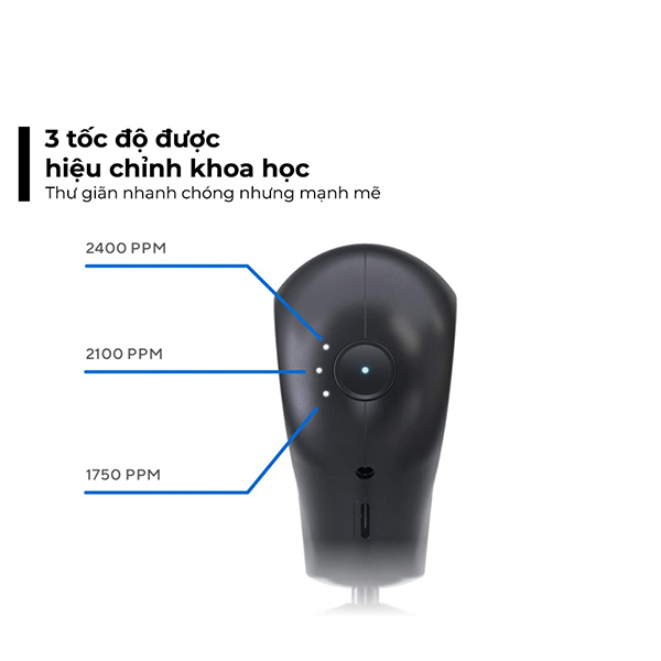 Súng massage Theragun Mini có thể tùy chỉnh 3 tốc độ (1750, 2100, 2400 PPM), các mức này đã được hãng nghiên cứu kĩ lượng để tối ưu nhất cho việc phục hồi cơ bắp.