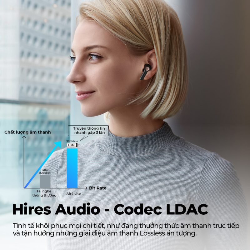 Khác với phiên bản Air 4 thì Air 4 Lite được trang bị công nghệ Hi-Res cùng codec LDAC độc quyền của Sony mang đến âm thanh với chất lượng lên đến 96kHz/32 bit cùng băng thông tối đa lên đến 990kbps - nhanh gấp 3 lần so với các mẫu tai nghe khác giúp âm thanh được tái tạo đầy tinh tế, khôi phục mọi chi tiết. Người dùng sẽ có thể trải nghiệm âm thanh vô cùng chân thật với SoundPEATS Air 4, đắm mình trong buổi ca nhạc với âm nhạc đầy sống động.