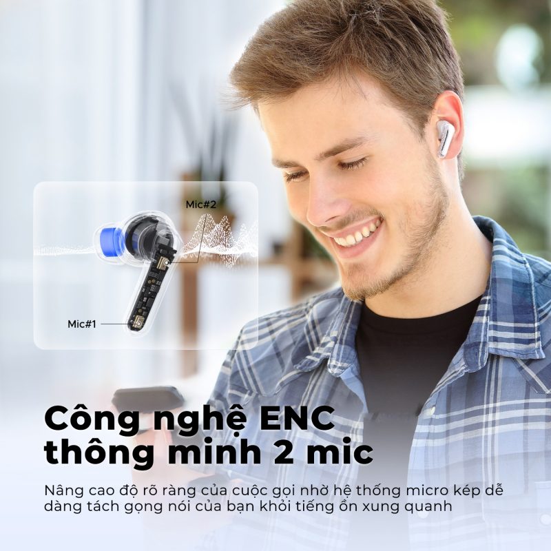 SoundPEATS Clear được trang bị 1 bộ mic kép cho mỗi bên tai nghe cùng công nghệ chống ồn môi trường ENC (Enviromental Noise Cancellation) với 1 mic phụ vụ việc thu nhận tiếng ồn và 1 mic phục vụ triệt tiêu tiếng ồn giúp lọc tối đa tiếng ồn và tạp âm khi trò chuyện tại nơi đông người. Giọng nói của người dùng được tái tạo chi tiết và trong trẻo trước khi được truyền tải đến đầu dây bên kia dù ở bất kỳ môi trường nào.