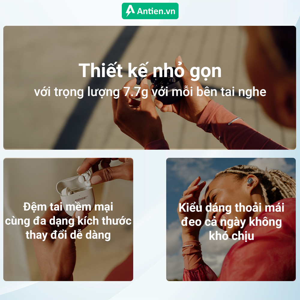 Thừa hưởng ngôn ngữ thiết kế đẳng cấp từ thế hệ tiền nhiệm, QuietComfort Ultra Earbuds 2025 được tối ưu để phù hợp với nhiều dáng tai khác nhau. Từ việc nghe nhạc, làm việc cho đến tập luyện, tai nghe mang lại cảm giác vừa vặn, chắc chắn nhưng vẫn êm ái suốt nhiều giờ. Với trọng lượng chỉ 7.7g cho mỗi bên tai, QCU Earbuds mang lại sự nhẹ nhàng cho đôi tai của bạn ngay cả khi sử dụng trong thời gian dài, từ đó giúp bạn tận hưởng âm nhạc 1 cách trọn vẹn.
