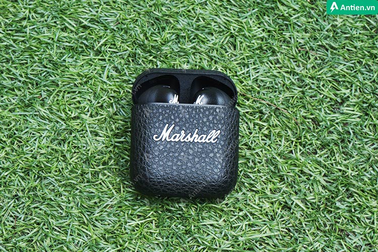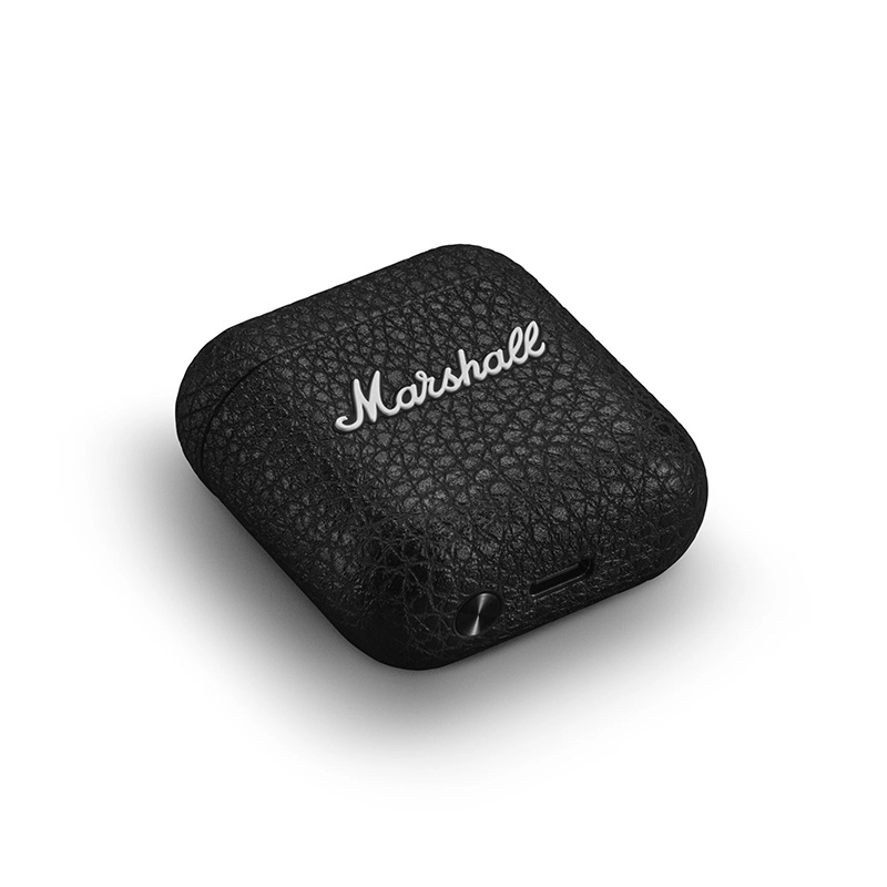 Phần hộp sạc cũng được làm bằng nhựa với vân giả da có khắc chữ Marshall trắng ở giữa rất rõ rệt và nổi bật. Phần dưới hộp sạc là nút kết nối bluetooth và cổng sạc Type C.
