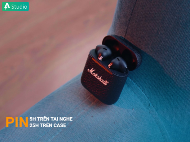 Tai nghe không dây Marshall Minor III có thể chơi nhạc liên tục trong 5 giờ, khi dùng hộp sạc có thể lên đến 25 giờ. Và bạn chỉ mất khoảng 15 phút để sạc nhanh thiết bị cho 1,5 tiếng chơi tiếp.